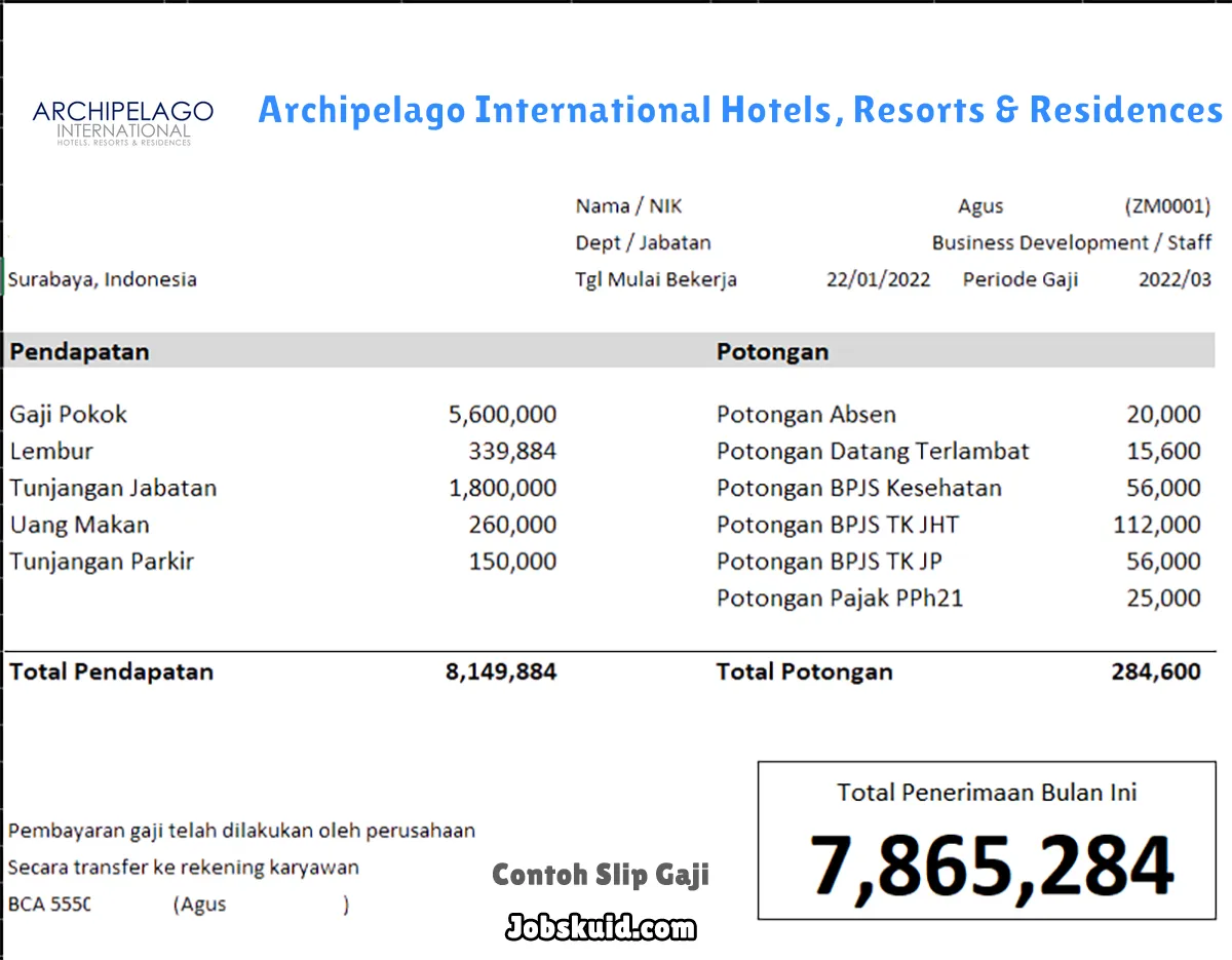 Gambar di atas adalah contoh slip gaji Archipelago International Hotels, Resorts & Residences. Slip gaji tersebut memuat informasi seperti gaji pokok, gaji lembur, bonus, tunjangan, potongan, dan total gaji.