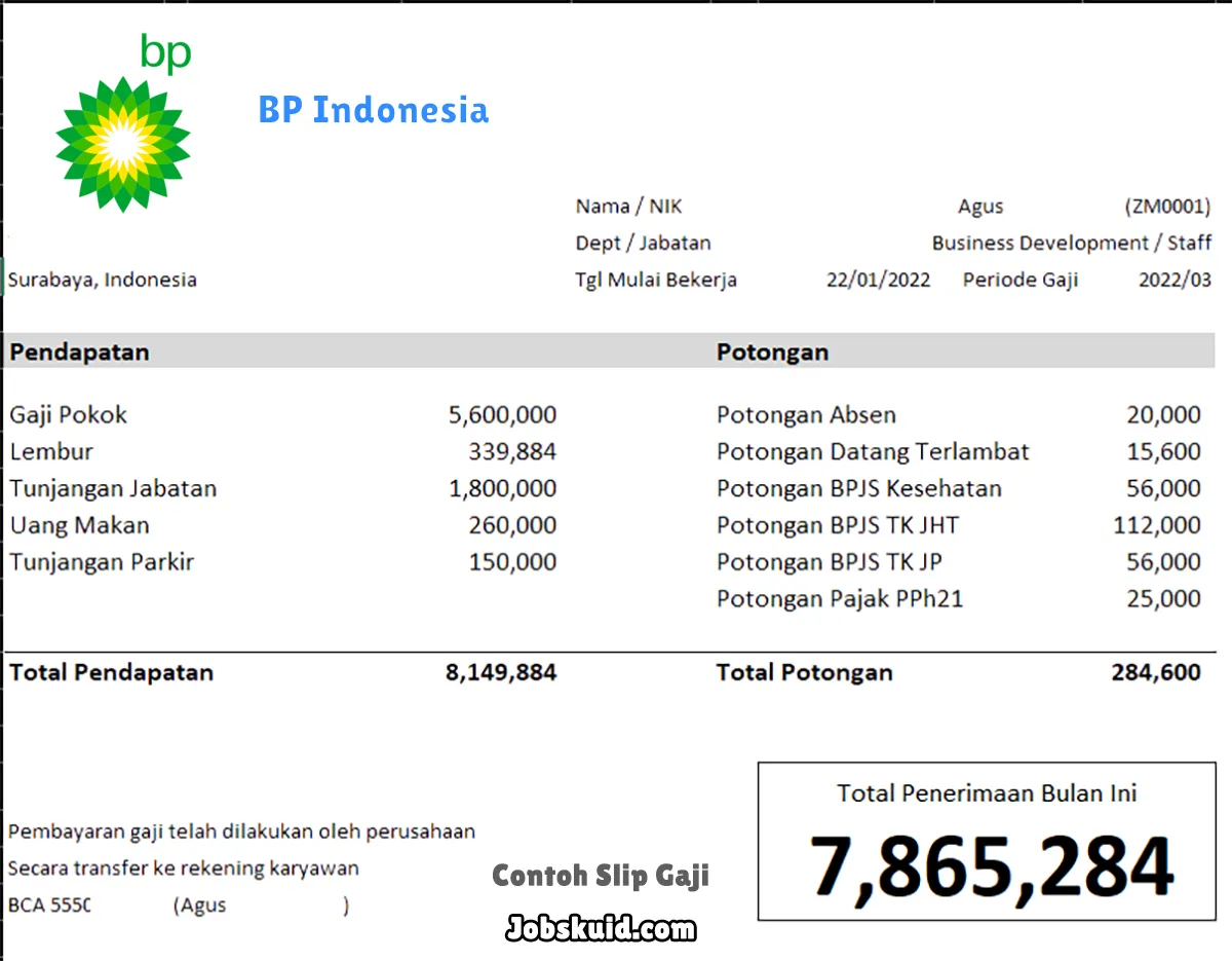 Gambar di atas adalah contoh slip gaji BP Indonesia. Slip gaji tersebut memuat informasi seperti gaji pokok, gaji lembur, bonus, tunjangan, potongan, dan total gaji.