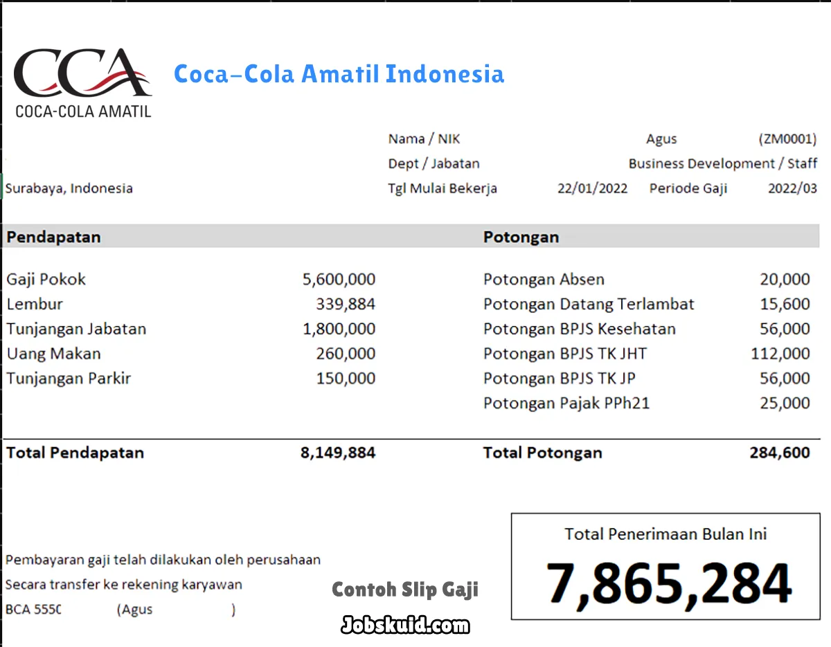 Berikut ini adalah contoh slip gaji Coca-Cola Amatil Indonesia.
