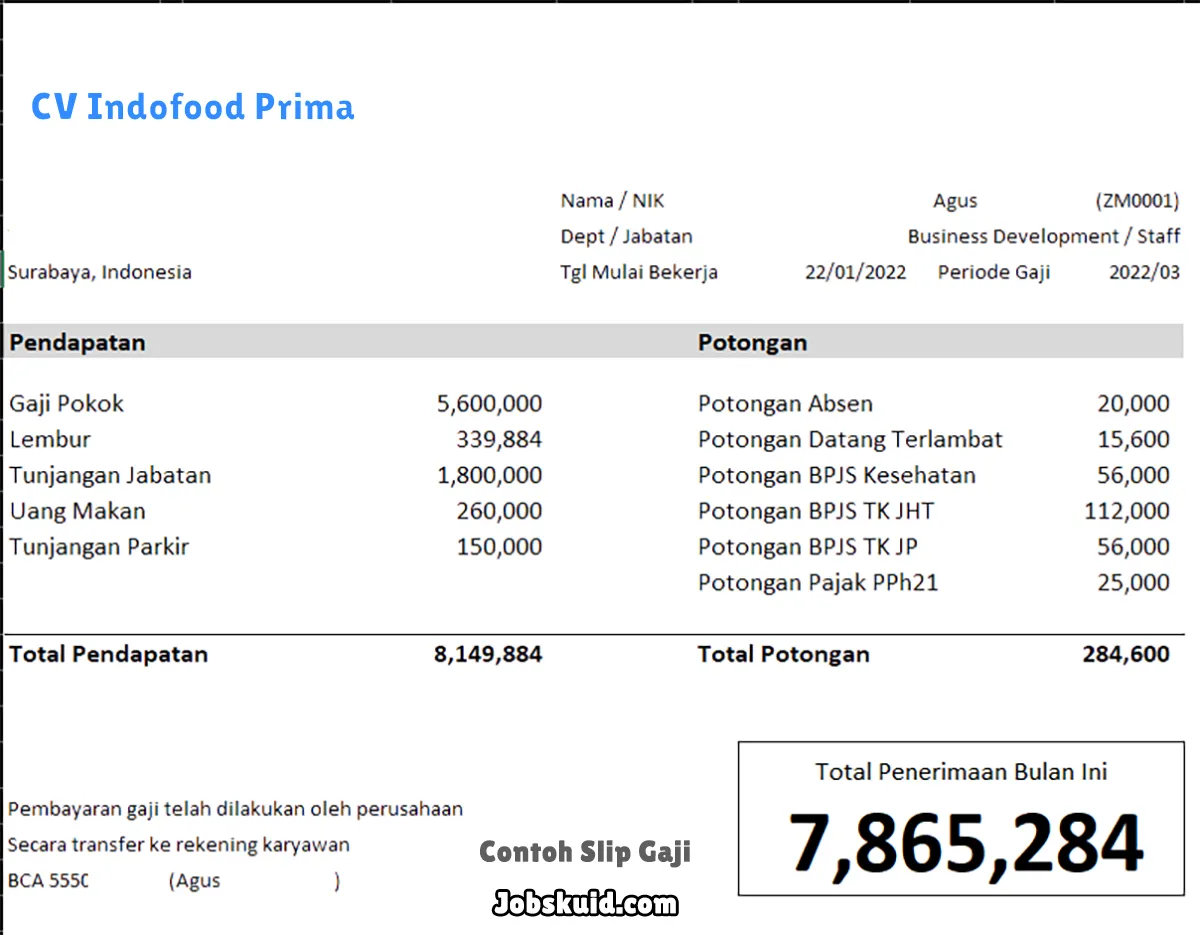 Gambar di atas adalah contoh slip gaji CV Indofood Prima. Slip gaji tersebut memuat informasi seperti gaji pokok, gaji lembur, bonus, tunjangan, potongan, dan total gaji.