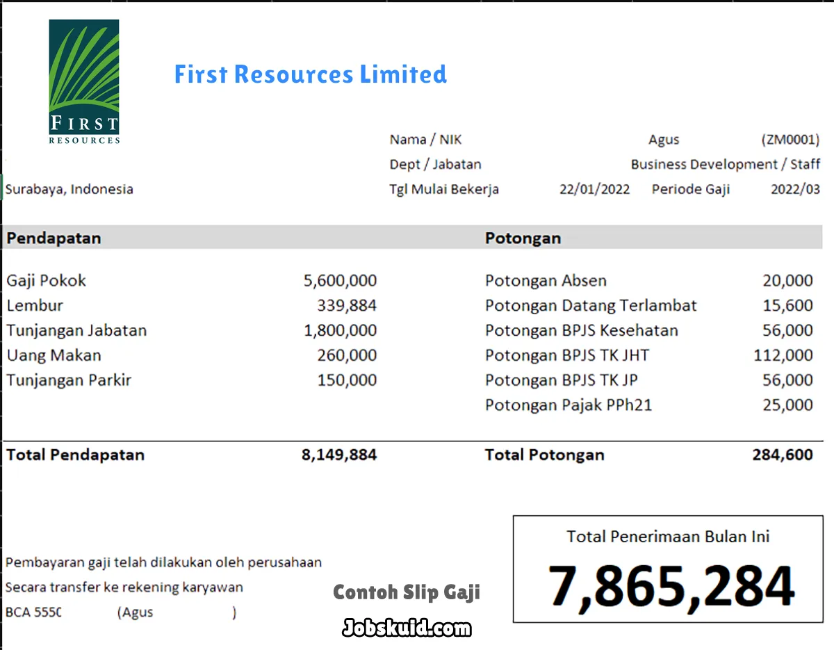 Gambar di atas adalah contoh slip gaji First Resources Limited. Slip gaji tersebut memuat informasi seperti gaji pokok, gaji lembur, bonus, tunjangan, potongan, dan total gaji.