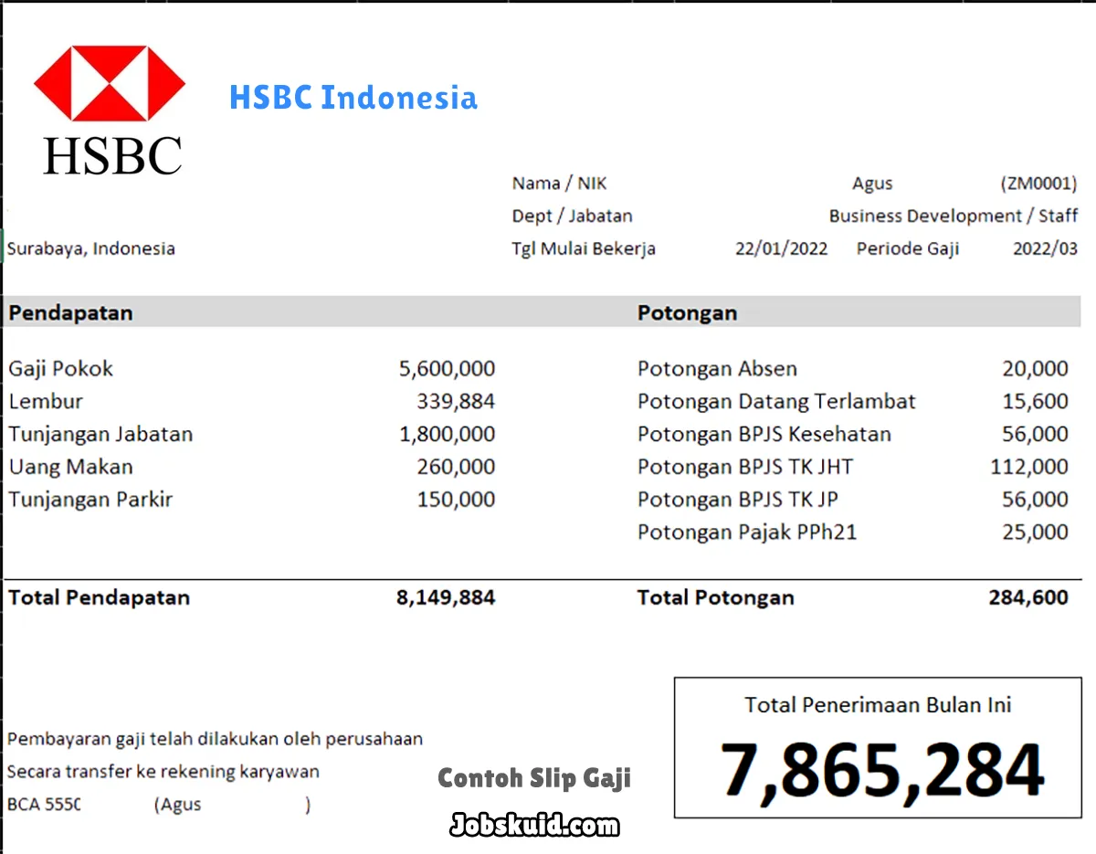 Berikut ini adalah contoh slip gaji HSBC Indonesia.