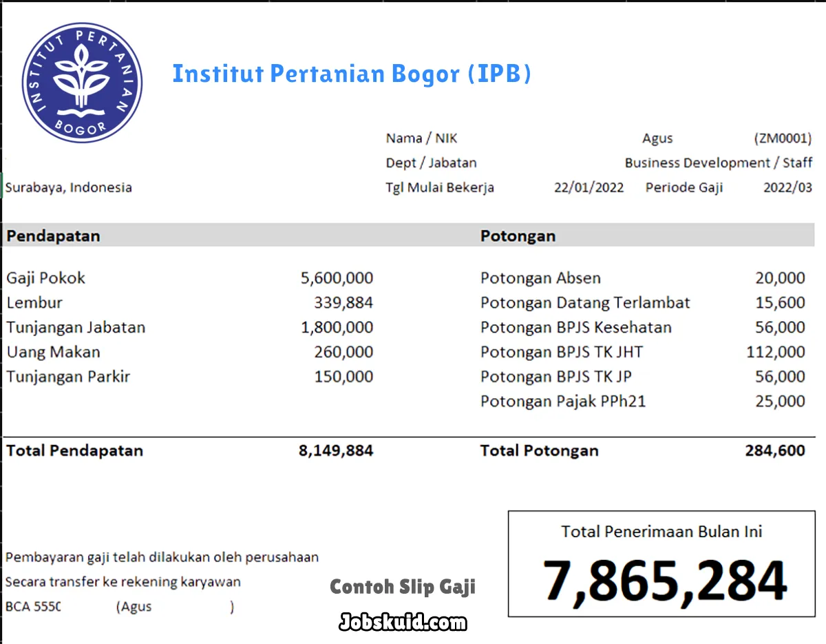 Berikut ini adalah contoh slip gaji Institut Pertanian Bogor (IPB).