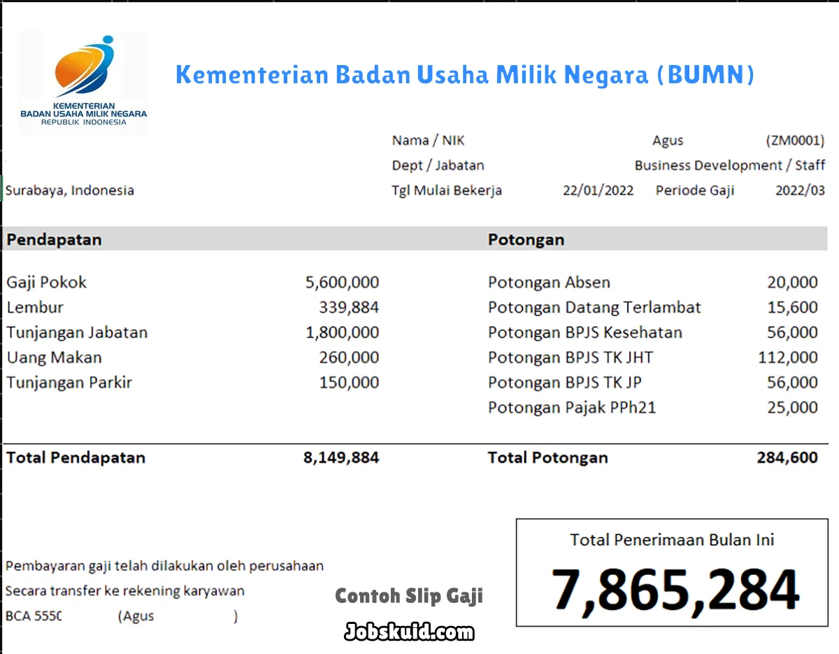 Berikut ini adalah contoh slip gaji Kementerian Badan Usaha Milik Negara (BUMN).