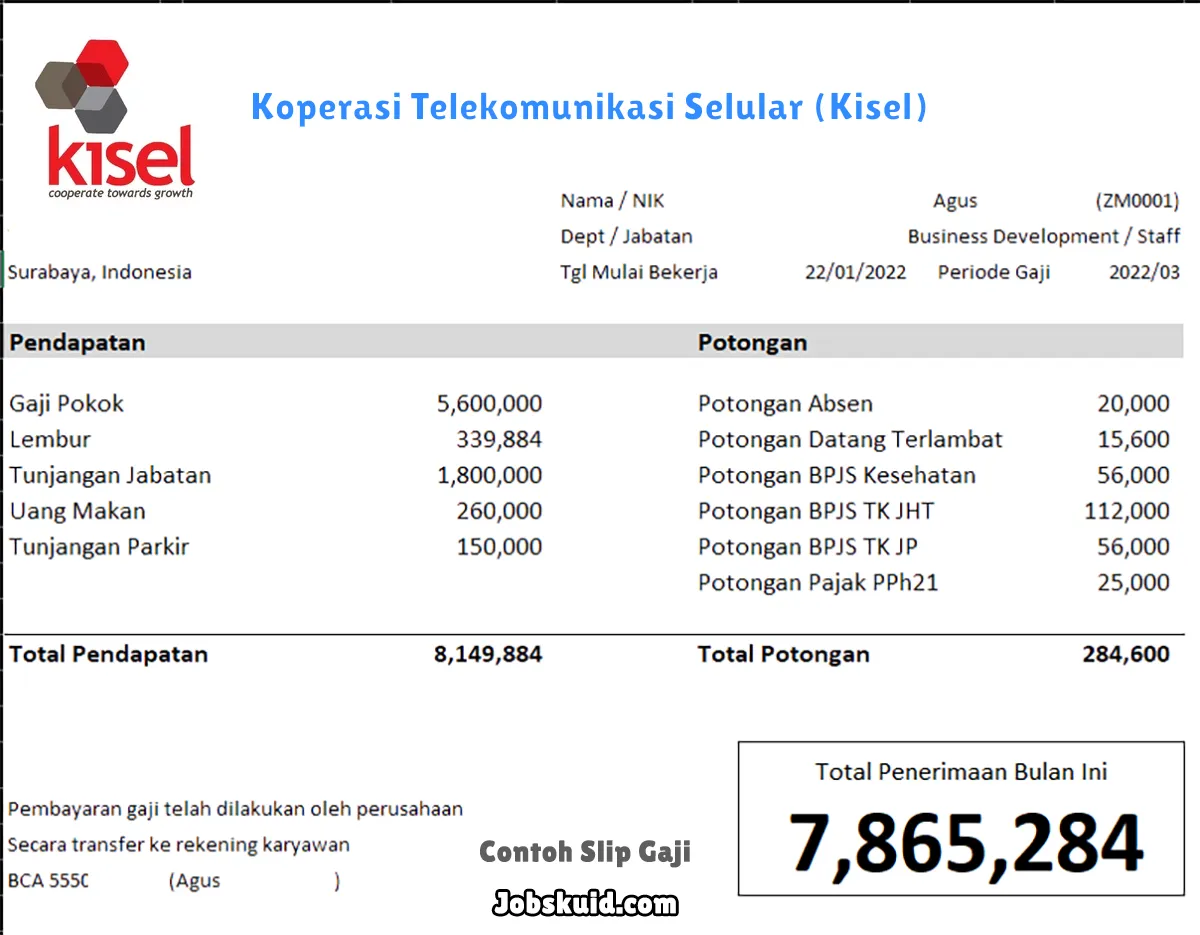 Berikut ini adalah contoh slip gaji Koperasi Telekomunikasi Selular (Kisel).