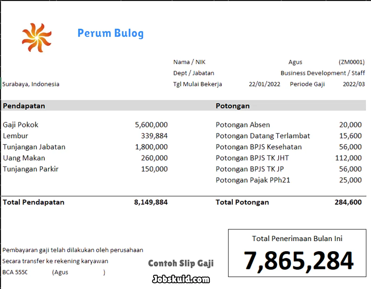 Gambar di atas adalah contoh slip gaji Perum Bulog. Slip gaji tersebut memuat informasi seperti gaji pokok, gaji lembur, bonus, tunjangan, potongan, dan total gaji.