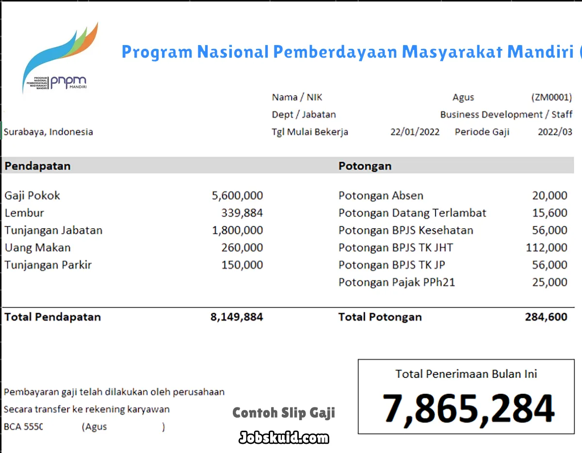 Berikut ini adalah contoh slip gaji Program Nasional Pemberdayaan Masyarakat Mandiri (PNPM Mandiri).