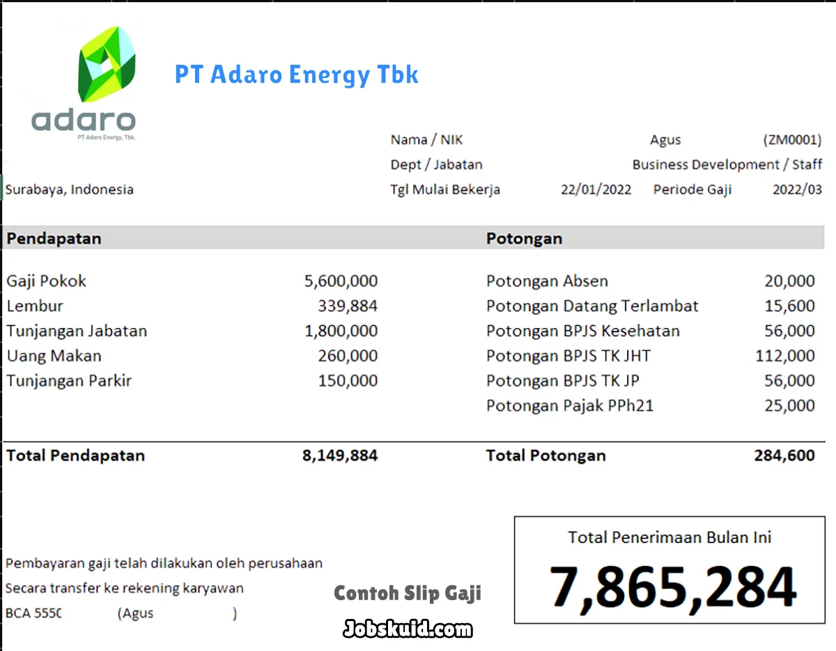Berikut ini adalah contoh slip gaji PT Adaro Energy Tbk.