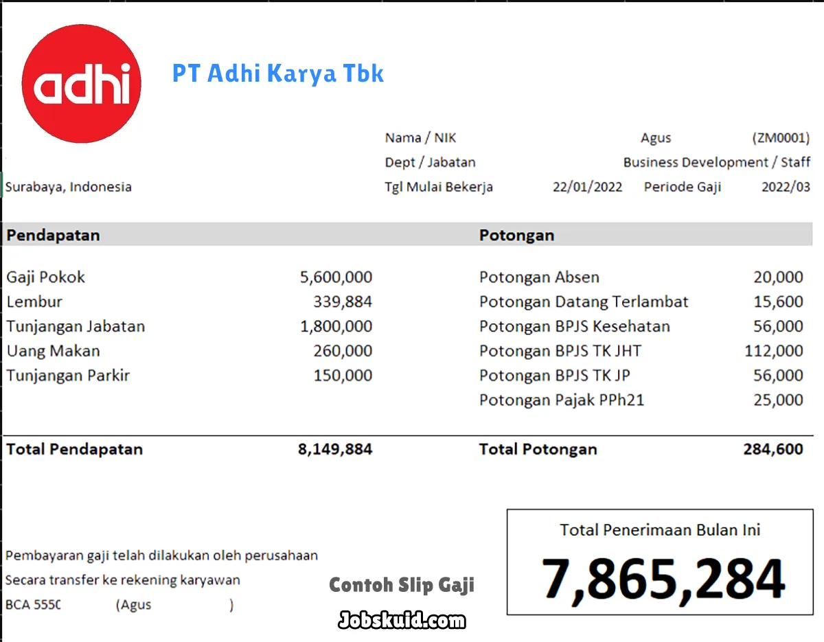 Berikut ini adalah contoh slip gaji PT Adhi Karya Tbk.