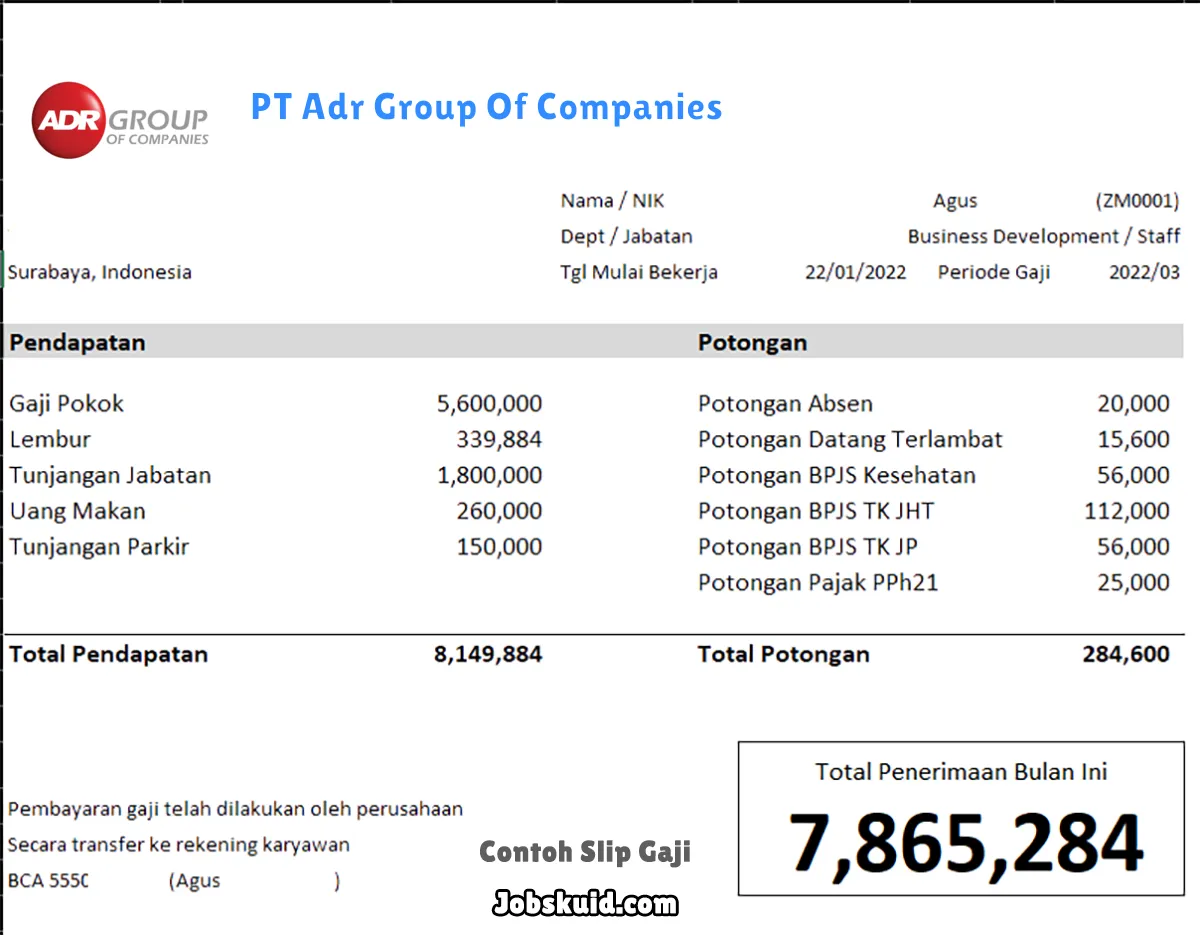 Berikut ini adalah contoh slip gaji PT Adr Group Of Companies.