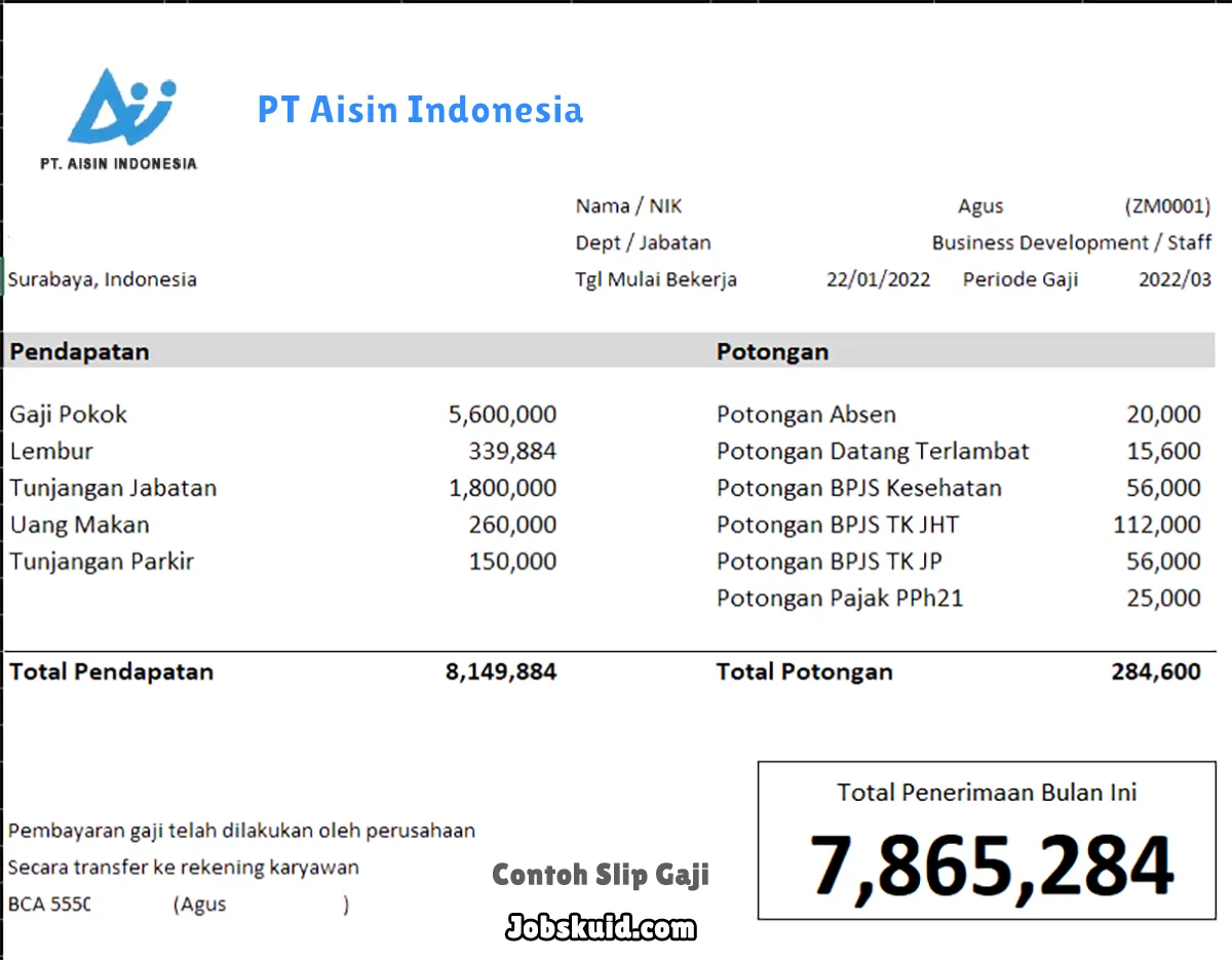 Gambar di atas adalah contoh slip gaji PT Aisin Indonesia. Slip gaji tersebut memuat informasi seperti gaji pokok, gaji lembur, bonus, tunjangan, potongan, dan total gaji.