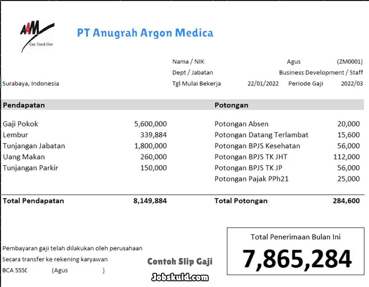 Gambar di atas adalah contoh slip gaji PT Anugrah Argon Medica. Slip gaji tersebut memuat informasi seperti gaji pokok, gaji lembur, bonus, tunjangan, potongan, dan total gaji.