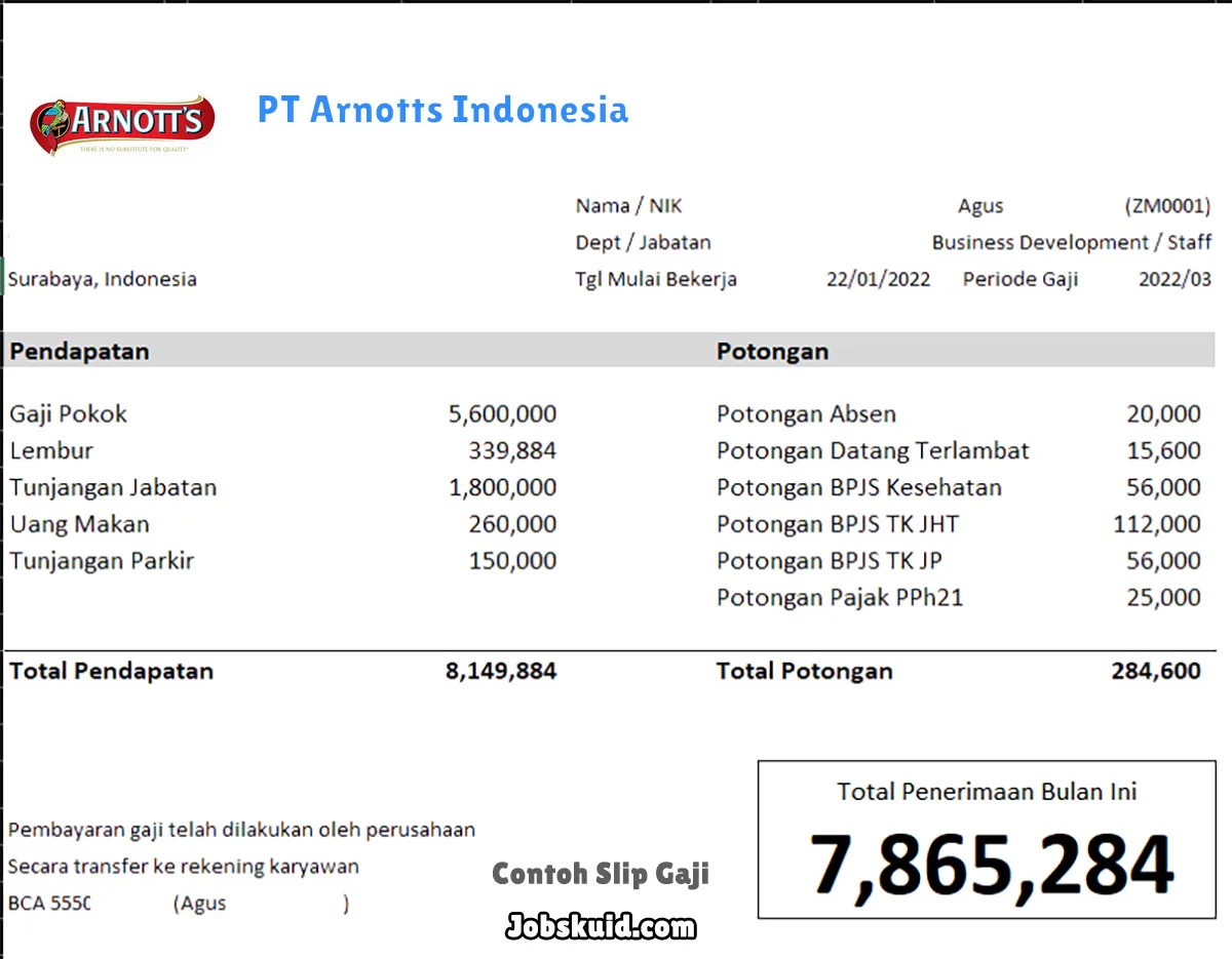 Gambar di atas adalah contoh slip gaji PT Arnotts Indonesia. Slip gaji tersebut memuat informasi seperti gaji pokok, gaji lembur, bonus, tunjangan, potongan, dan total gaji.
