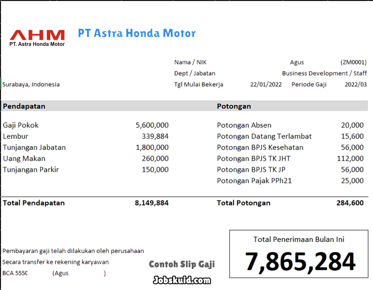 Berikut ini adalah contoh slip gaji PT Astra Honda Motor.