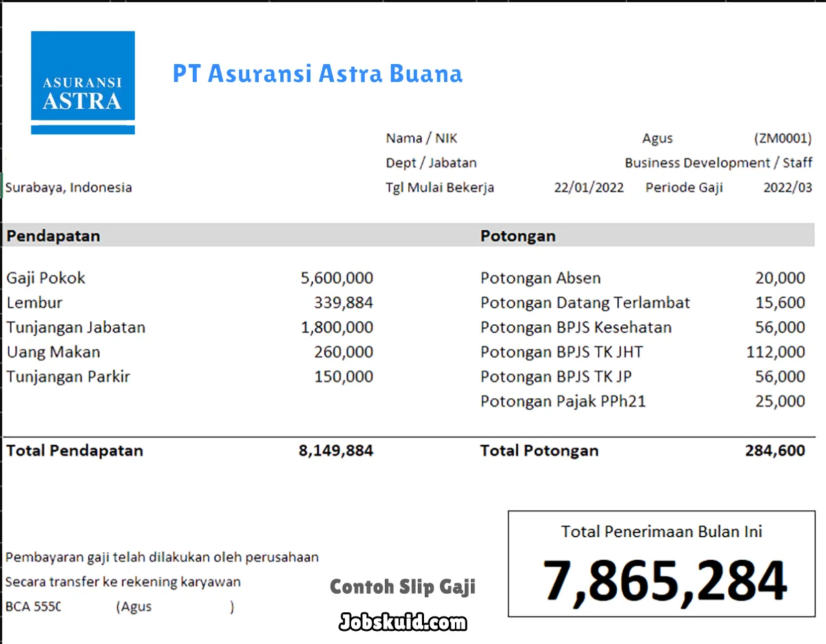 Gambar di atas adalah contoh slip gaji PT Asuransi Astra Buana. Slip gaji tersebut memuat informasi seperti gaji pokok, gaji lembur, bonus, tunjangan, potongan, dan total gaji.