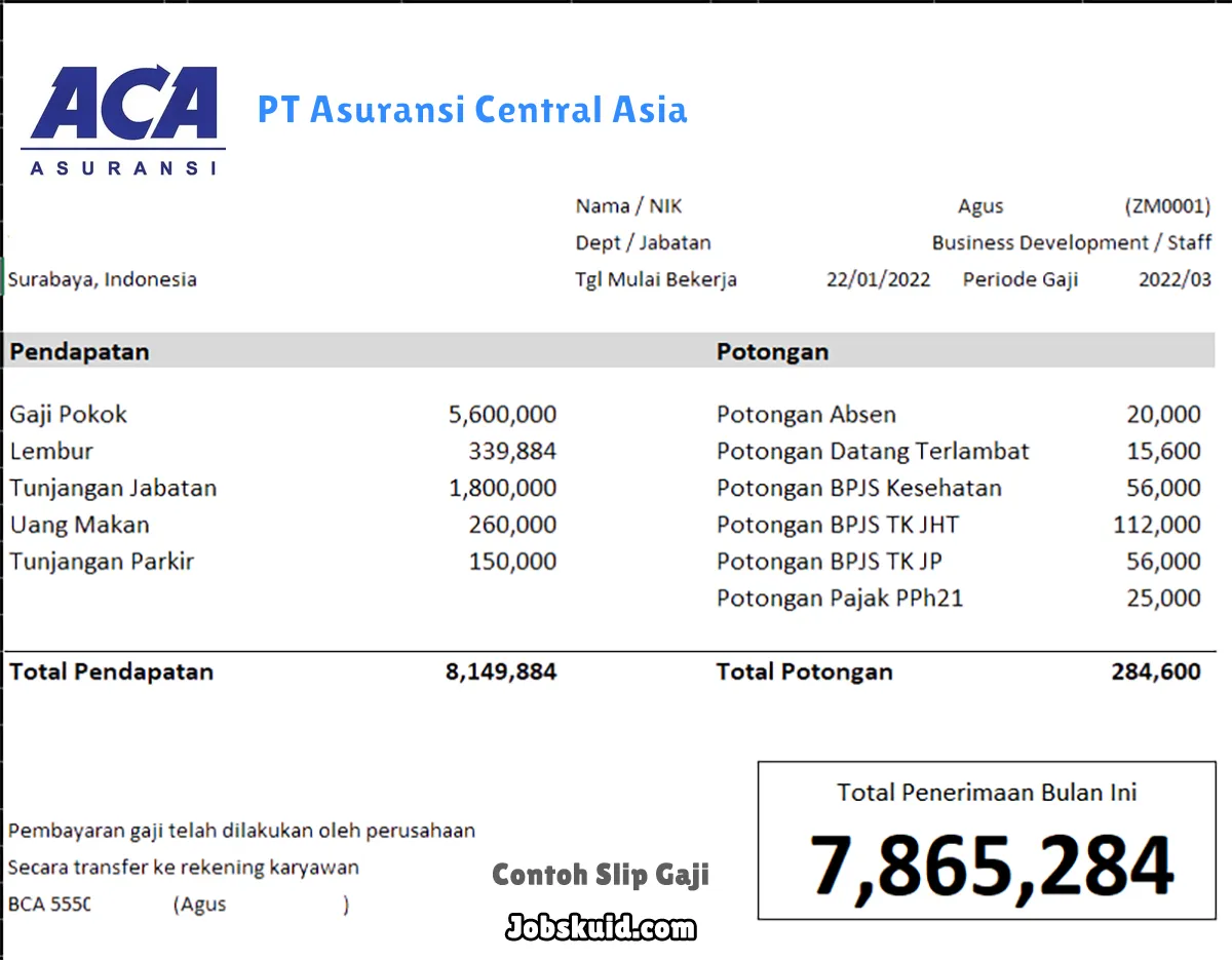 Gambar di atas adalah contoh slip gaji PT Asuransi Central Asia. Slip gaji tersebut memuat informasi seperti gaji pokok, gaji lembur, bonus, tunjangan, potongan, dan total gaji.