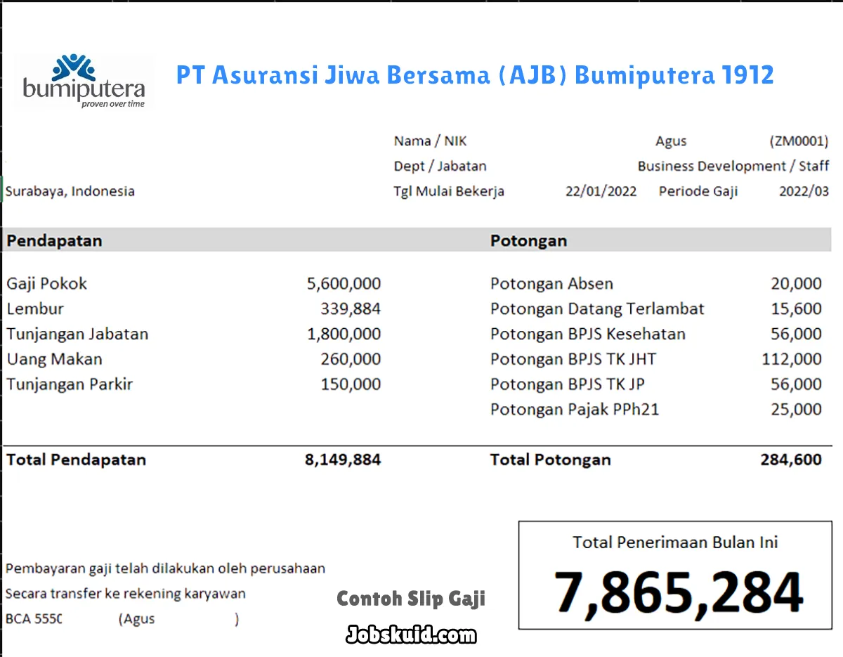 Berikut ini adalah contoh slip gaji PT Asuransi Jiwa Bersama (AJB) Bumiputera 1912.