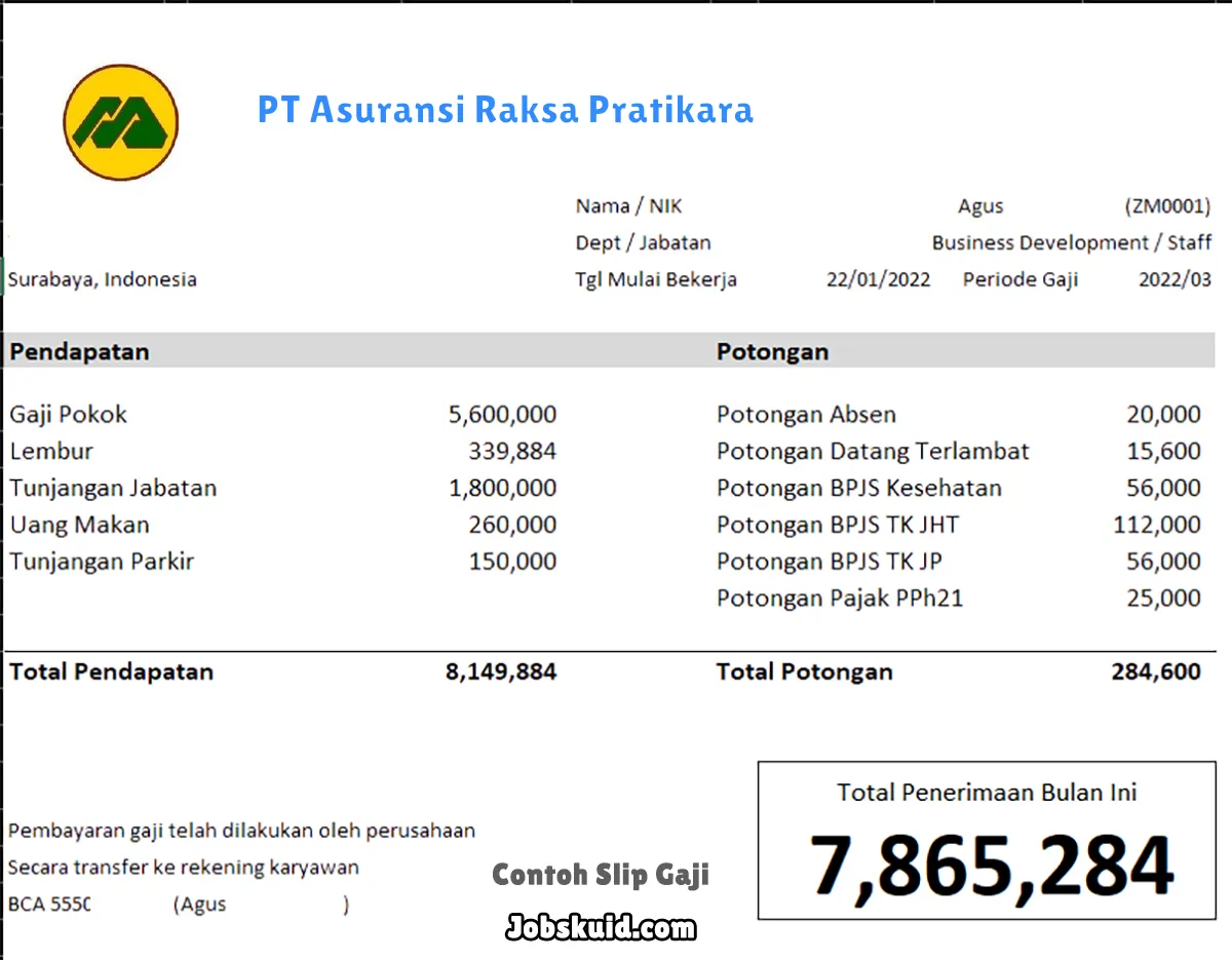 Gambar di atas adalah contoh slip gaji PT Asuransi Raksa Pratikara. Slip gaji tersebut memuat informasi seperti gaji pokok, gaji lembur, bonus, tunjangan, potongan, dan total gaji.
