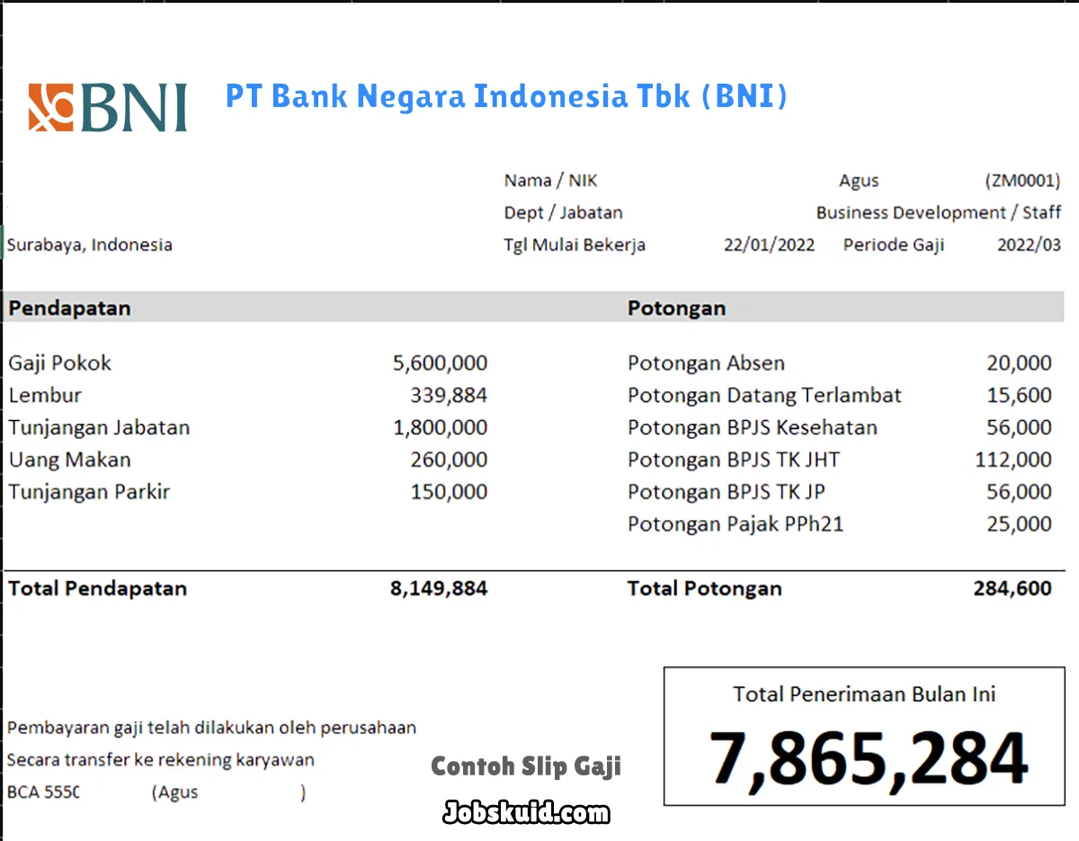 Gambar di atas adalah contoh slip gaji PT Bank Negara Indonesia Tbk (BNI). Slip gaji tersebut memuat informasi seperti gaji pokok, gaji lembur, bonus, tunjangan, potongan, dan total gaji.