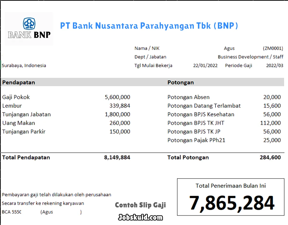 Gambar di atas adalah contoh slip gaji PT Bank Nusantara Parahyangan Tbk (BNP). Slip gaji tersebut memuat informasi seperti gaji pokok, gaji lembur, bonus, tunjangan, potongan, dan total gaji.