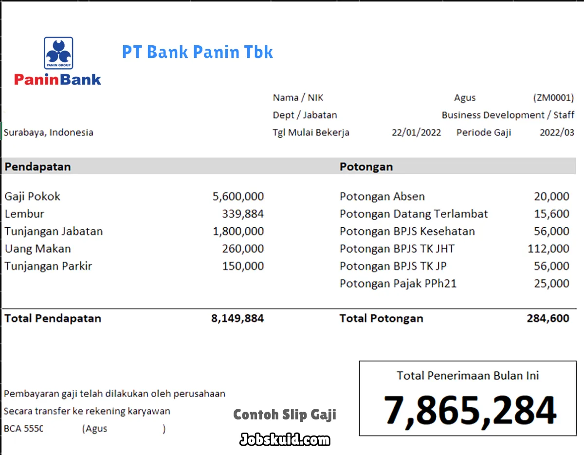 Gambar di atas adalah contoh slip gaji PT Bank Panin Tbk. Slip gaji tersebut memuat informasi seperti gaji pokok, gaji lembur, bonus, tunjangan, potongan, dan total gaji.