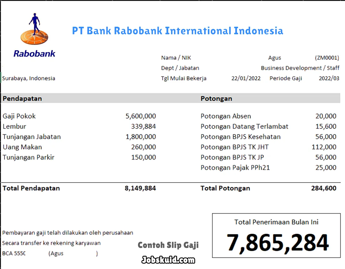Gambar di atas adalah contoh slip gaji PT Bank Rabobank International Indonesia. Slip gaji tersebut memuat informasi seperti gaji pokok, gaji lembur, bonus, tunjangan, potongan, dan total gaji.