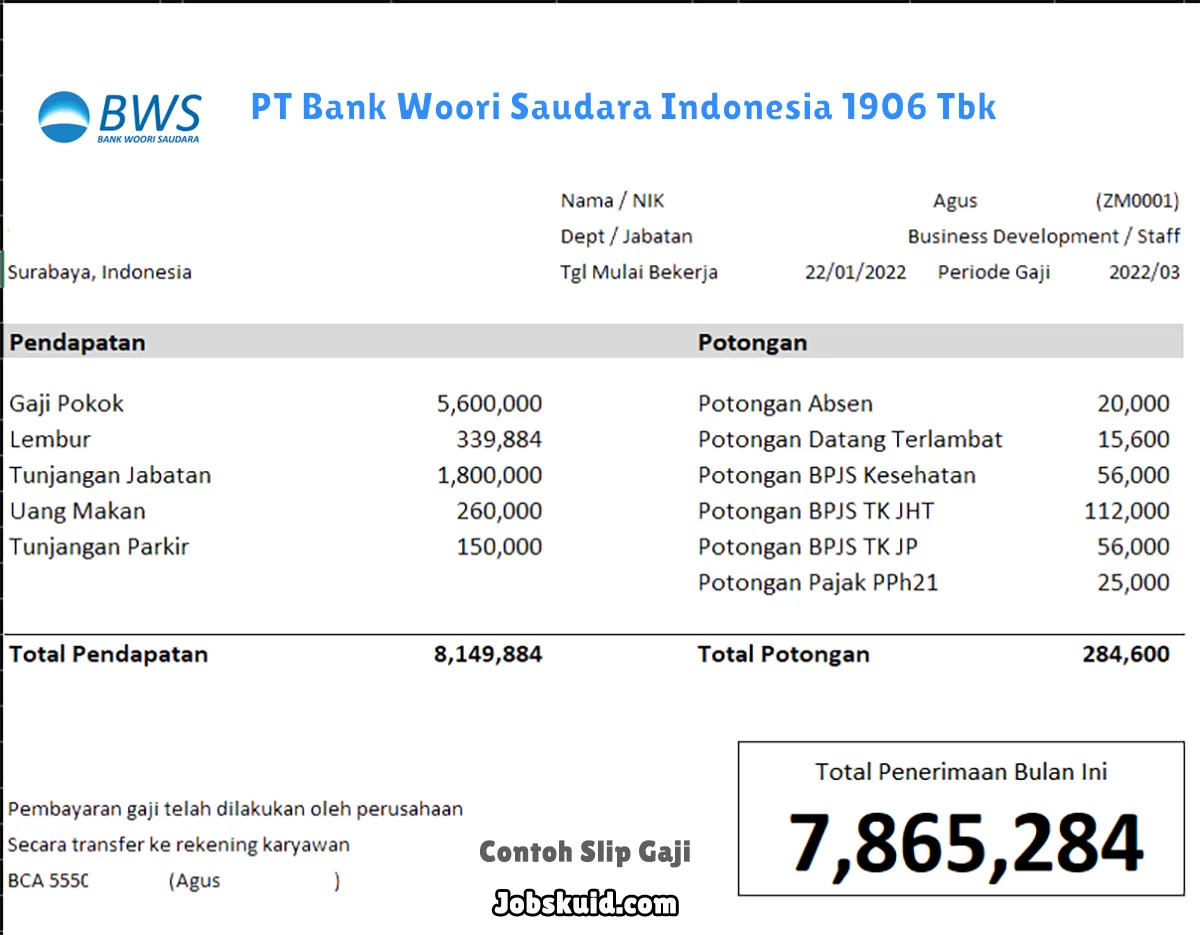 Gambar di atas adalah contoh slip gaji PT Bank Woori Saudara Indonesia 1906 Tbk. Slip gaji tersebut memuat informasi seperti gaji pokok, gaji lembur, bonus, tunjangan, potongan, dan total gaji.