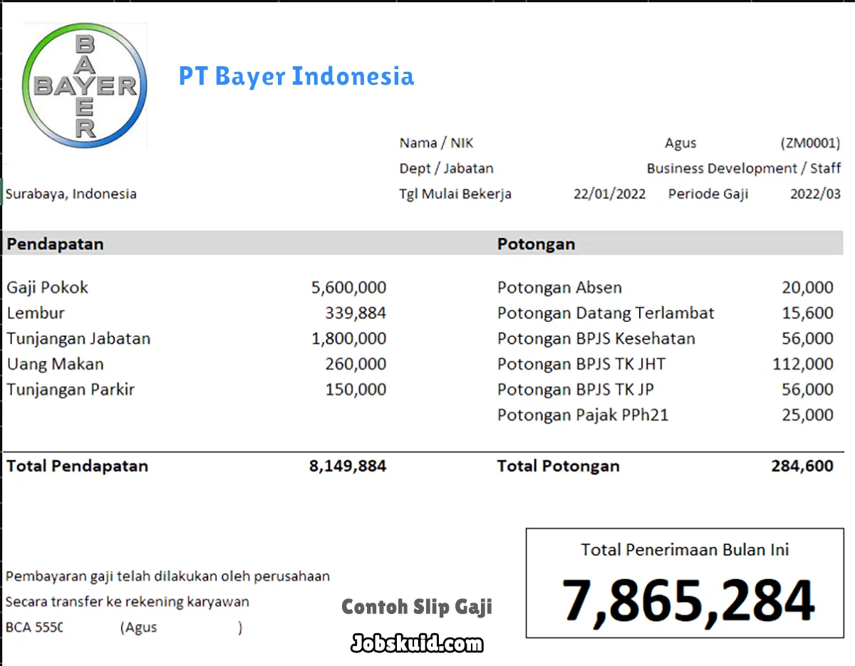 Gambar di atas adalah contoh slip gaji PT Bayer Indonesia. Slip gaji tersebut memuat informasi seperti gaji pokok, gaji lembur, bonus, tunjangan, potongan, dan total gaji.