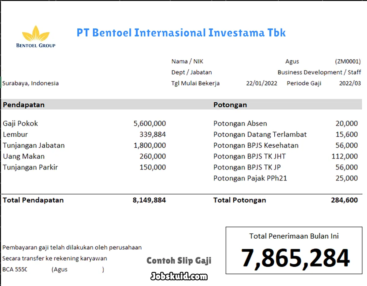 Berikut ini adalah contoh slip gaji PT Bentoel Internasional Investama Tbk.