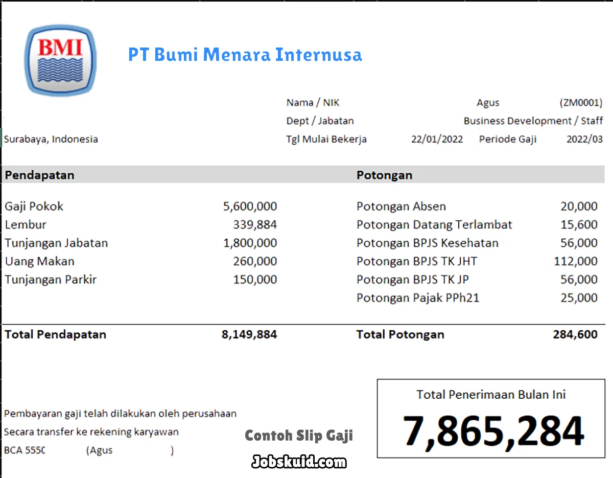 Gambar di atas adalah contoh slip gaji PT Bumi Menara Internusa. Slip gaji tersebut memuat informasi seperti gaji pokok, gaji lembur, bonus, tunjangan, potongan, dan total gaji.