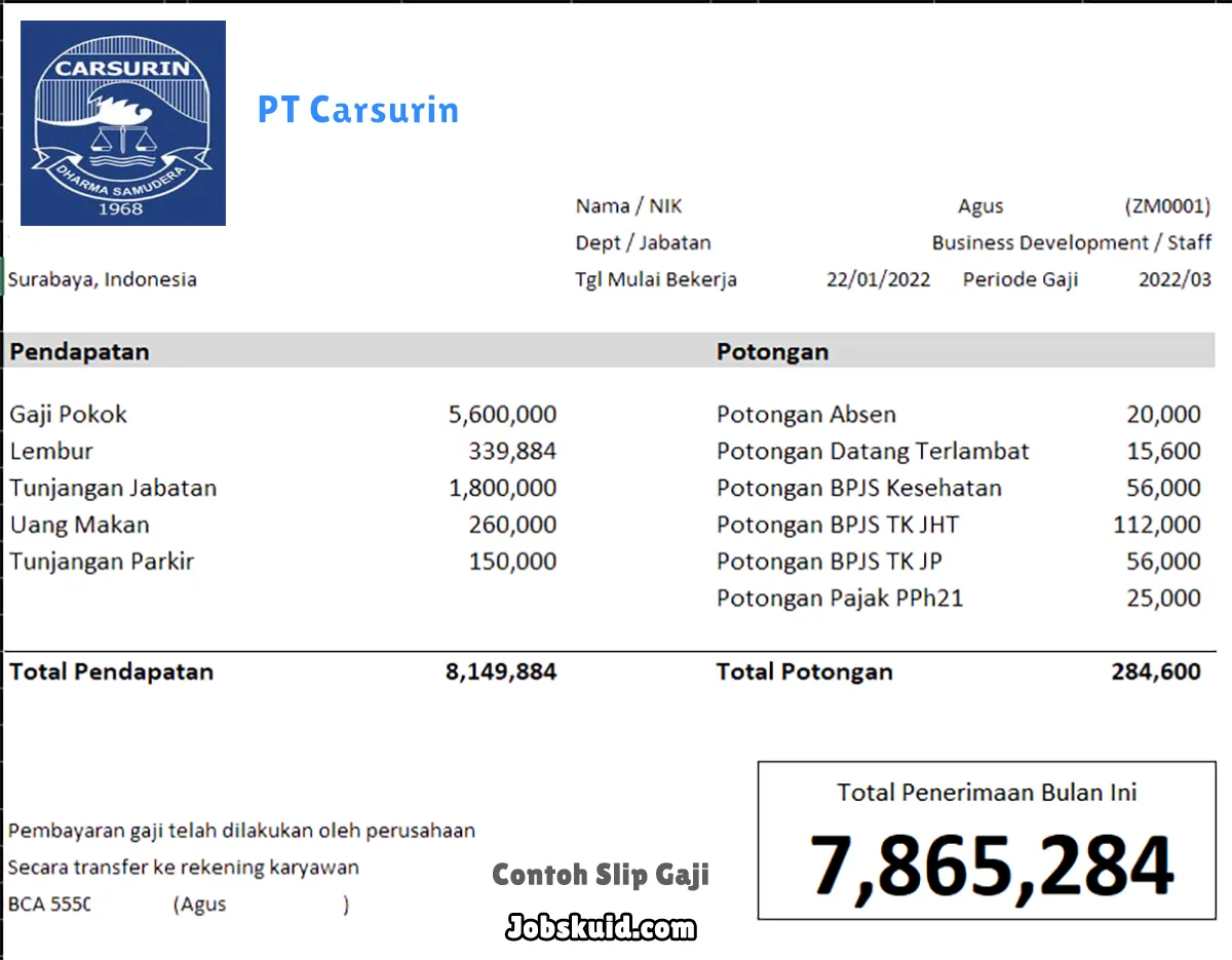 Gambar di atas adalah contoh slip gaji PT Carsurin. Slip gaji tersebut memuat informasi seperti gaji pokok, gaji lembur, bonus, tunjangan, potongan, dan total gaji.