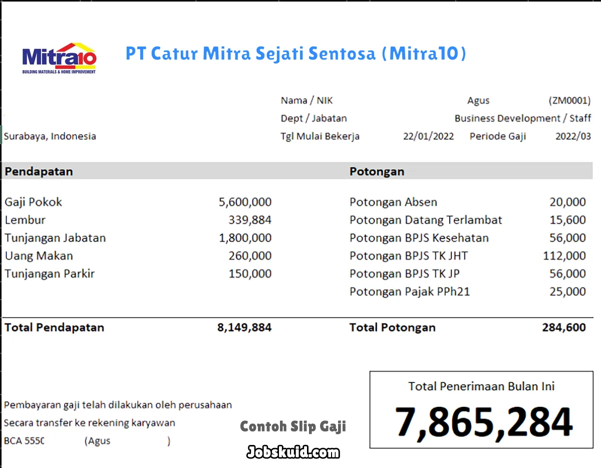 Gambar di atas adalah contoh slip gaji PT Catur Mitra Sejati Sentosa (Mitra10). Slip gaji tersebut memuat informasi seperti gaji pokok, gaji lembur, bonus, tunjangan, potongan, dan total gaji.