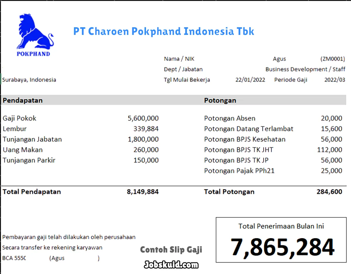 Berikut ini adalah contoh slip gaji PT Charoen Pokphand Indonesia Tbk.
