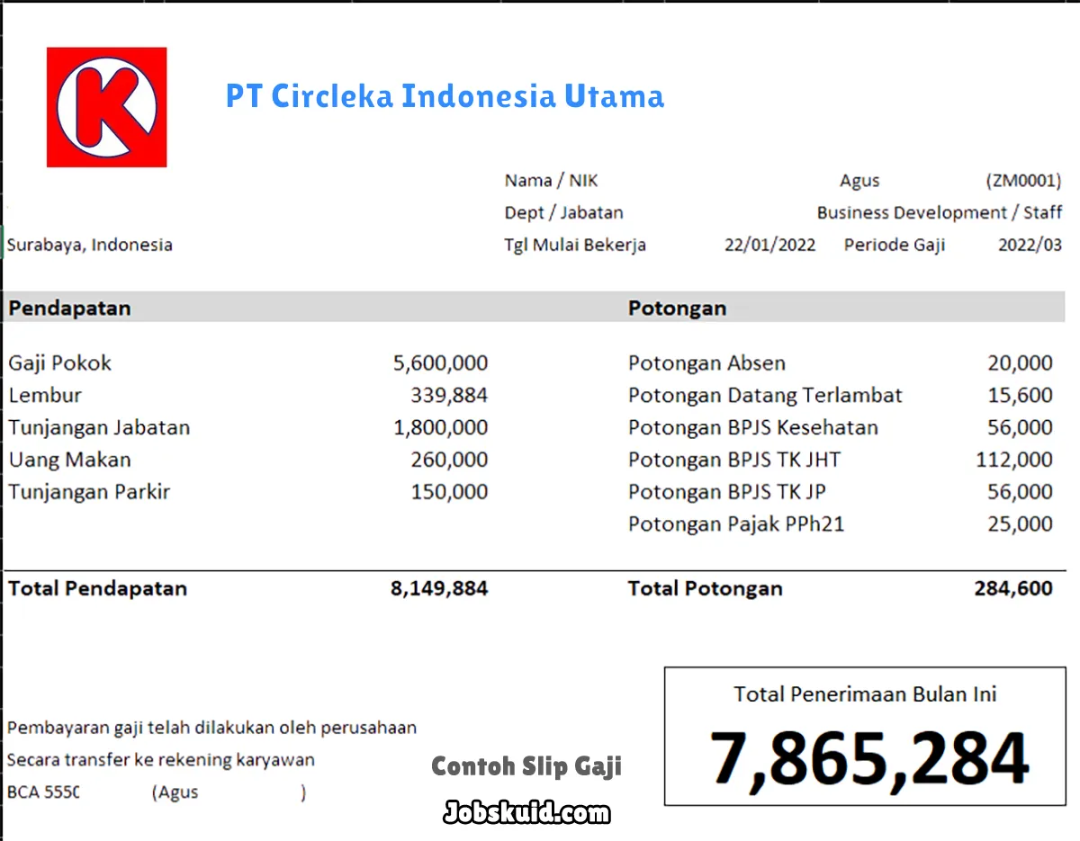 Gambar di atas adalah contoh slip gaji PT Circleka Indonesia Utama . Slip gaji tersebut memuat informasi seperti gaji pokok, gaji lembur, bonus, tunjangan, potongan, dan total gaji.