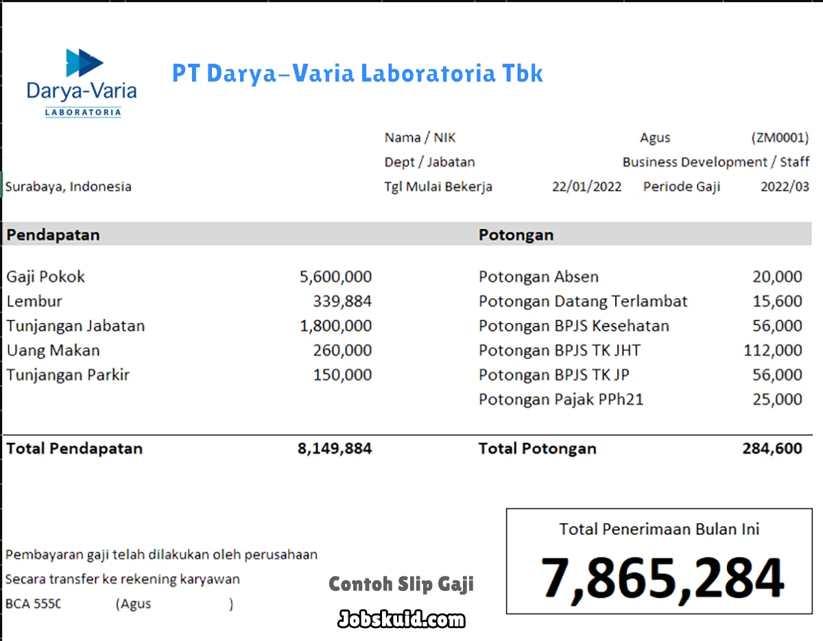 Berikut ini adalah contoh slip gaji PT Darya-Varia Laboratoria Tbk.