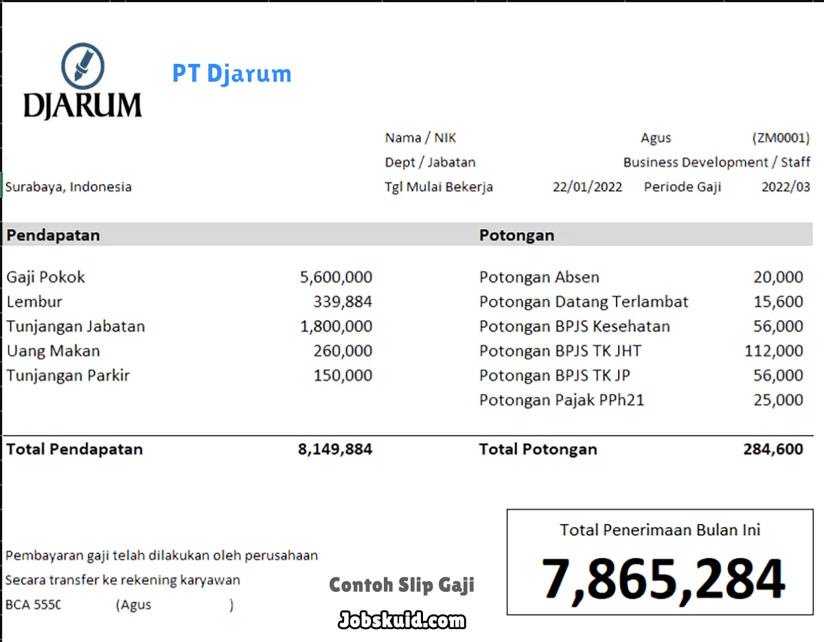 Gambar di atas adalah contoh slip gaji PT Djarum. Slip gaji tersebut memuat informasi seperti gaji pokok, gaji lembur, bonus, tunjangan, potongan, dan total gaji.