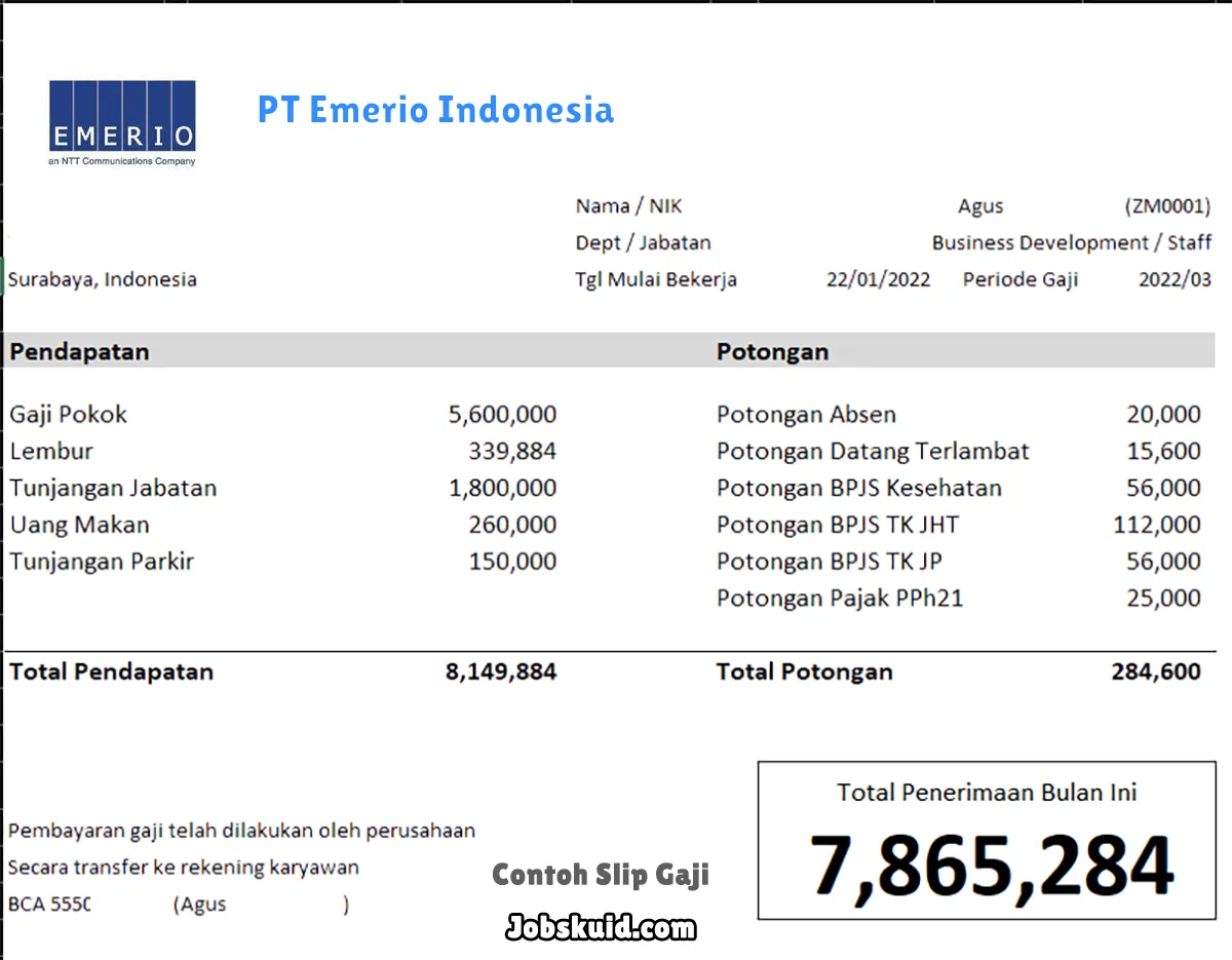 Gambar di atas adalah contoh slip gaji PT Emerio Indonesia. Slip gaji tersebut memuat informasi seperti gaji pokok, gaji lembur, bonus, tunjangan, potongan, dan total gaji.