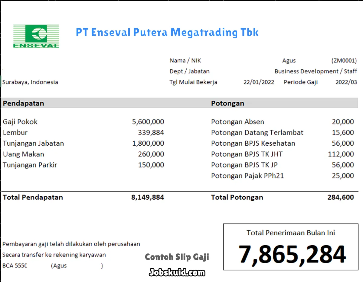 Gambar di atas adalah contoh slip gaji PT Enseval Putera Megatrading Tbk. Slip gaji tersebut memuat informasi seperti gaji pokok, gaji lembur, bonus, tunjangan, potongan, dan total gaji.