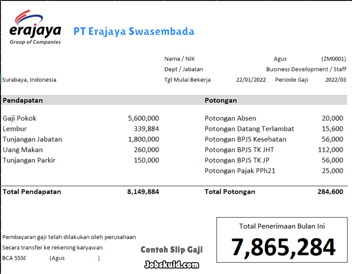 Gambar di atas adalah contoh slip gaji PT Erajaya Swasembada. Slip gaji tersebut memuat informasi seperti gaji pokok, gaji lembur, bonus, tunjangan, potongan, dan total gaji.