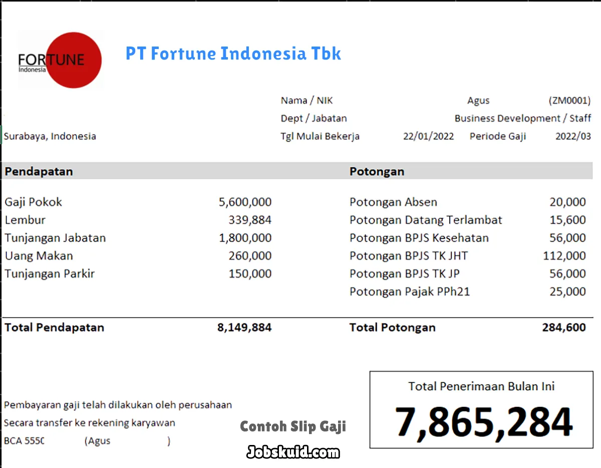Gambar di atas adalah contoh slip gaji PT Fortune Indonesia Tbk. Slip gaji tersebut memuat informasi seperti gaji pokok, gaji lembur, bonus, tunjangan, potongan, dan total gaji.