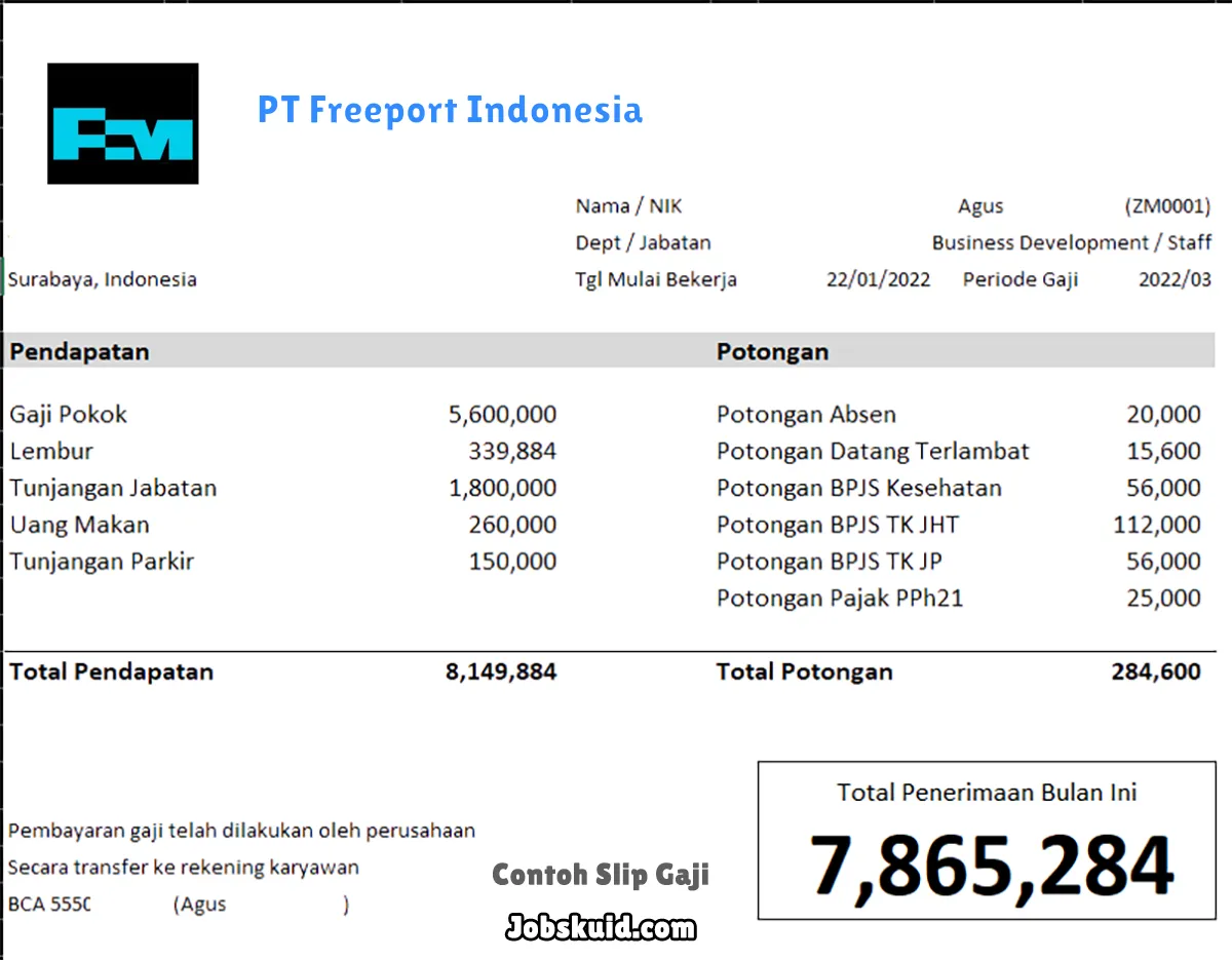 Berikut ini adalah contoh slip gaji PT Freeport Indonesia.