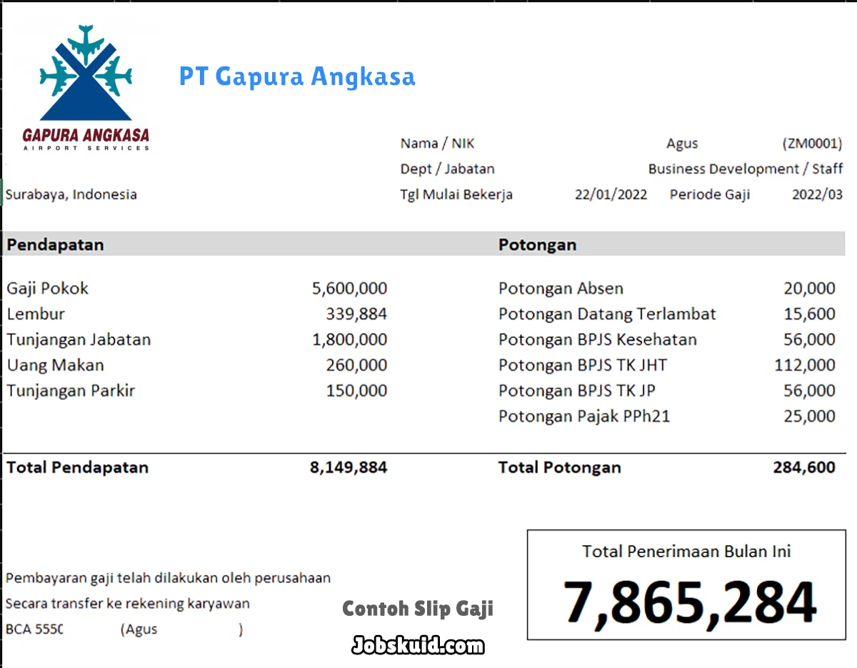 Gambar di atas adalah contoh slip gaji PT Gapura Angkasa. Slip gaji tersebut memuat informasi seperti gaji pokok, gaji lembur, bonus, tunjangan, potongan, dan total gaji.