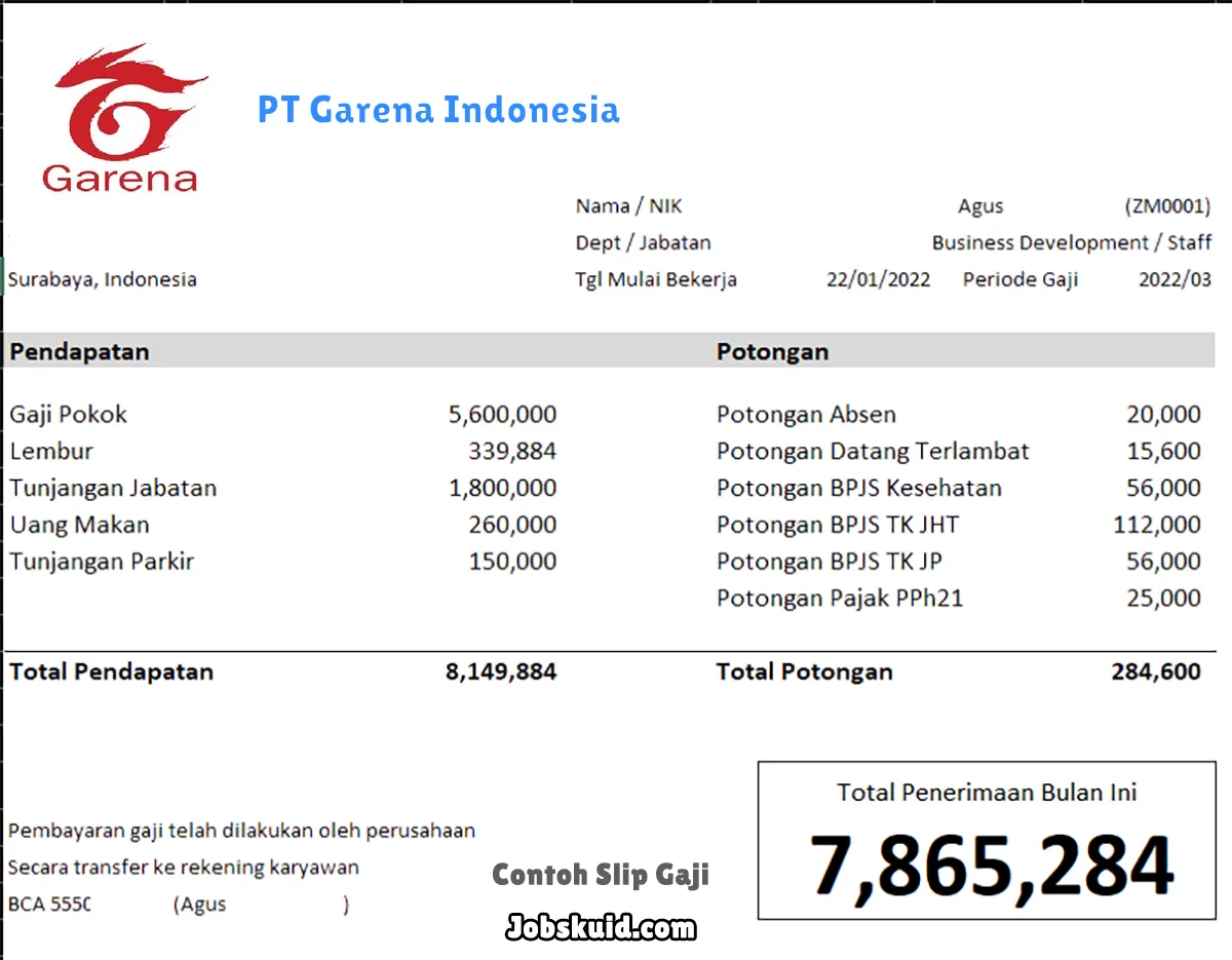 Gambar di atas adalah contoh slip gaji PT Garena Indonesia. Slip gaji tersebut memuat informasi seperti gaji pokok, gaji lembur, bonus, tunjangan, potongan, dan total gaji.