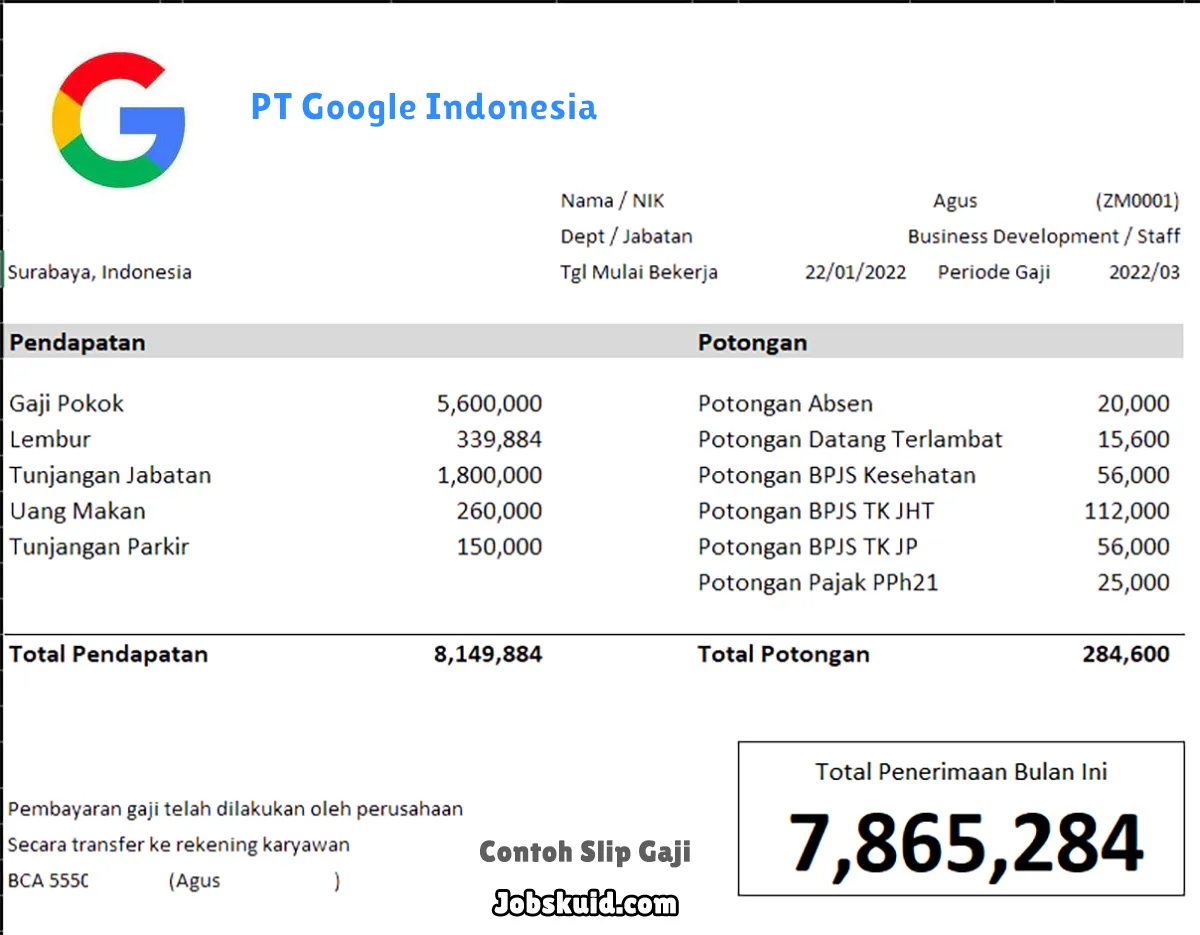 Gambar di atas adalah contoh slip gaji PT Google Indonesia. Slip gaji tersebut memuat informasi seperti gaji pokok, gaji lembur, bonus, tunjangan, potongan, dan total gaji.