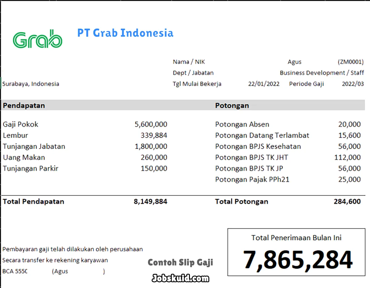 Gambar di atas adalah contoh slip gaji PT Grab Indonesia. Slip gaji tersebut memuat informasi seperti gaji pokok, gaji lembur, bonus, tunjangan, potongan, dan total gaji.
