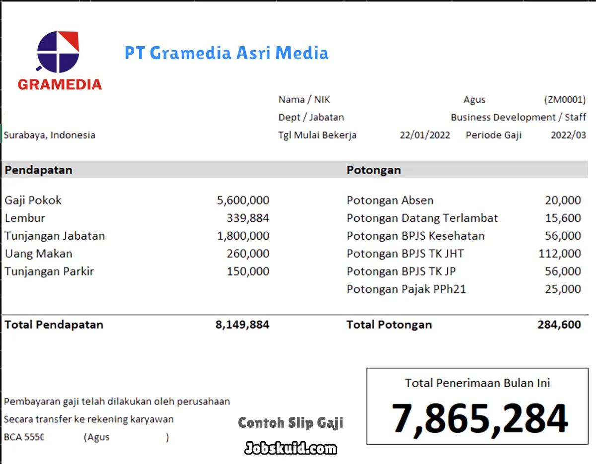 Gambar di atas adalah contoh slip gaji PT Gramedia Asri Media. Slip gaji tersebut memuat informasi seperti gaji pokok, gaji lembur, bonus, tunjangan, potongan, dan total gaji.