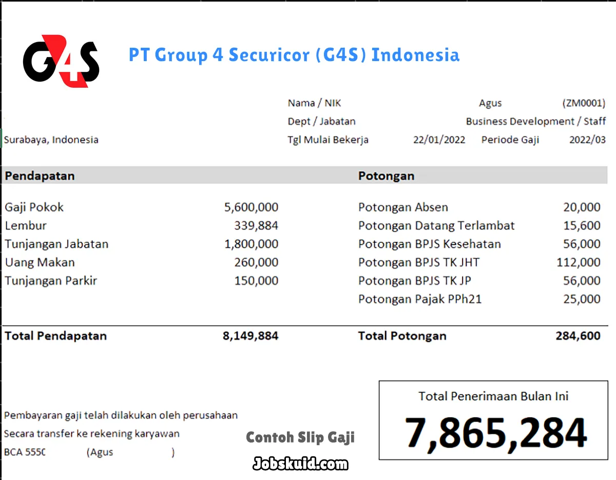 Gambar di atas adalah contoh slip gaji PT Group 4 Securicor (G4S) Indonesia. Slip gaji tersebut memuat informasi seperti gaji pokok, gaji lembur, bonus, tunjangan, potongan, dan total gaji.