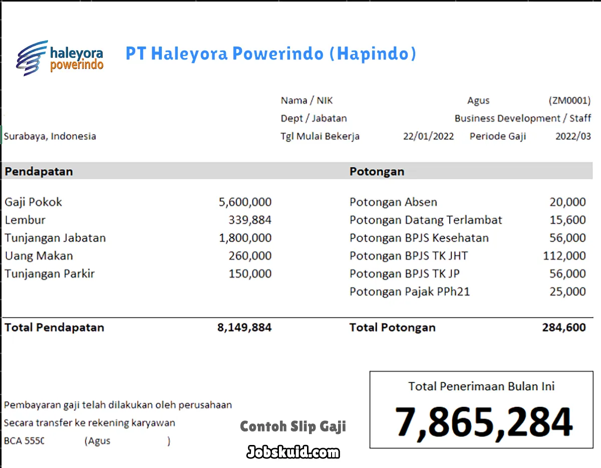 Gambar di atas adalah contoh slip gaji PT Haleyora Powerindo (Hapindo). Slip gaji tersebut memuat informasi seperti gaji pokok, gaji lembur, bonus, tunjangan, potongan, dan total gaji.