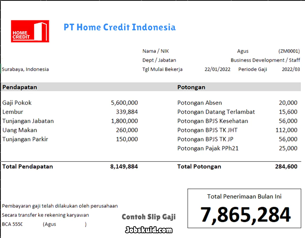 Gambar di atas adalah contoh slip gaji PT Home Credit Indonesia. Slip gaji tersebut memuat informasi seperti gaji pokok, gaji lembur, bonus, tunjangan, potongan, dan total gaji.