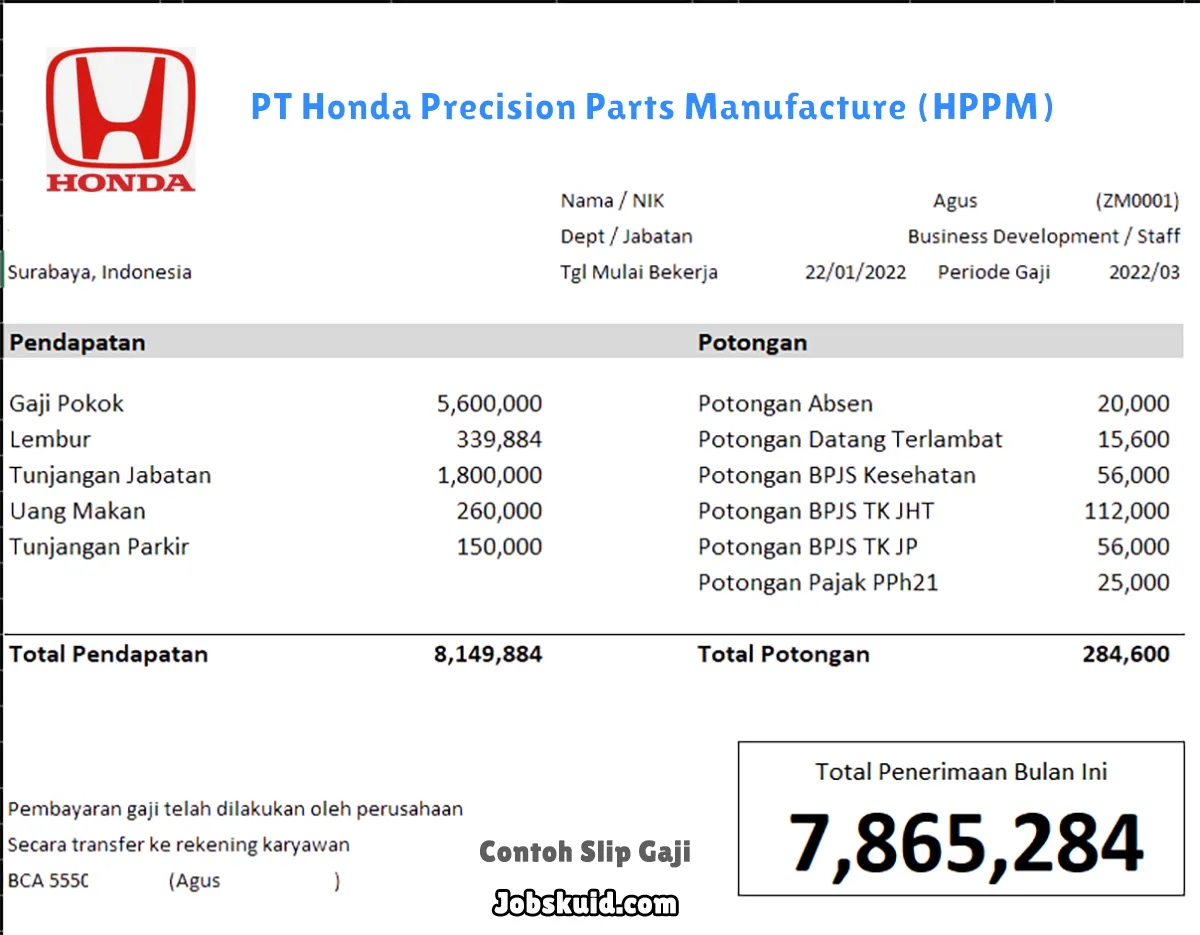 Berikut ini adalah contoh slip gaji PT Honda Precision Parts Manufacture (HPPM).